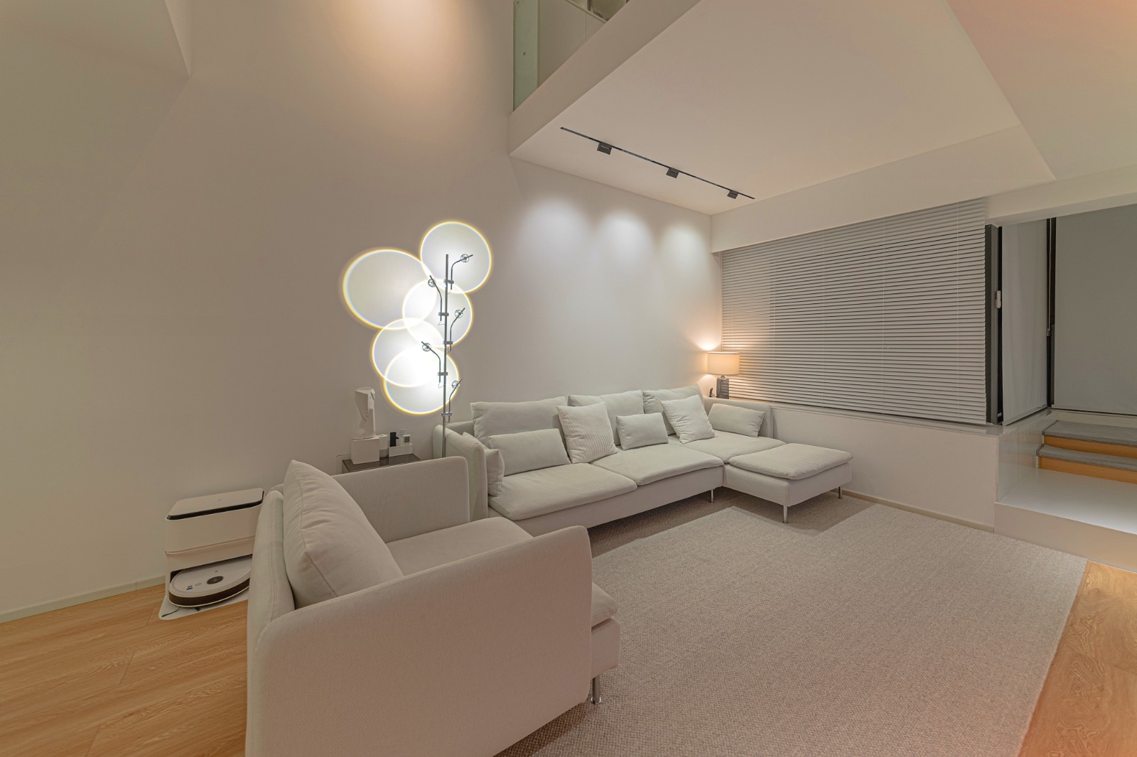 客厅空间,入目就是一片白,因为是极简风,所以在整体的硬装上基本以白色为主,不做多余的装饰物,视觉上也会显得空间更大一点,更能体现出跃层大宅的优势。 软装搭配上,家具也都以极简实用为主,跟墙面同色系的布艺沙发,颜值高,舒适度更强。