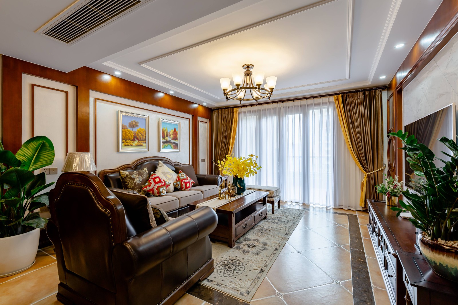 沙发背景墙做了对称和谐的护墙板,搭配两幅带有秋日气息的装饰画,加入适当的绿植摆件,就像是置身于枫叶国一样。即使家具选择的是深色调,但在小细节的摆件上,包括沙发的造型轮廓,有着欧式风的独特气息。