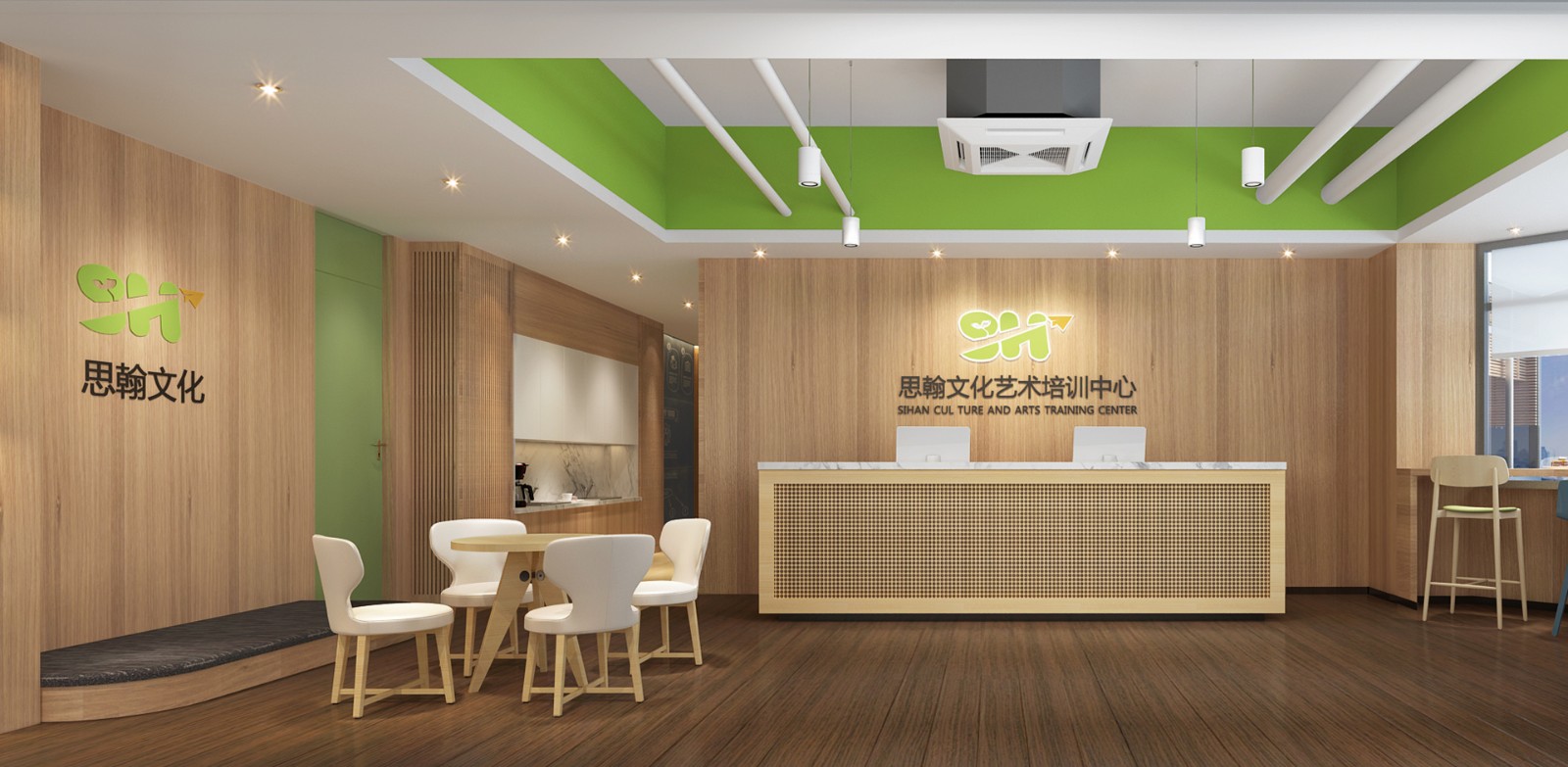 本案为儿童教育类方案,上诚考虑到儿童注意力很难集中,需要更少的干扰,以“视觉净化”为设计主题,尽量简化空间和造型,越干净越符合教学需求。追求简约的设计手法,打造一个家长和孩子都喜欢的场所。在设计中,大面积使用原木色和白色,并用简约造型营造清爽干净的室内环境。开敞明亮的接待前台,配以视觉鲜明的绿色。既增加了趣味,又贯彻了视觉净化主题。