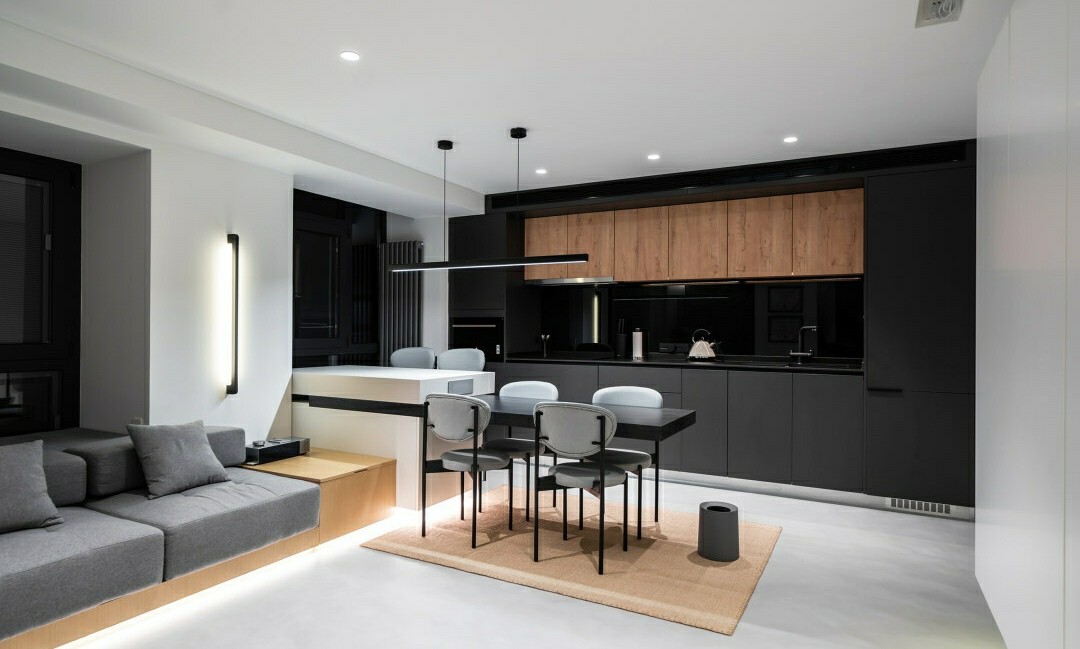 黑、白、灰和木色的相互调和,达到无形中放大空间的效果。灰色微水泥地面搭配白墙,使浅灰色衬托出家具的选品,不让空间抢走物件的风采。