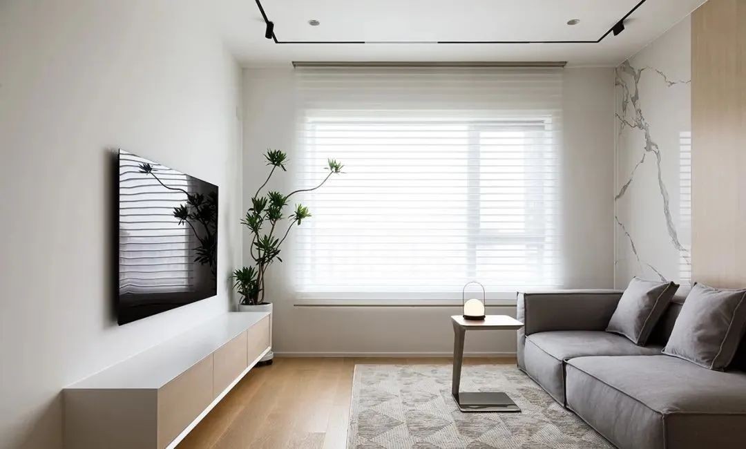 客厅,沙发墙采用了大理石岩板+木饰面板+木栅格的组合,顶面设计了黑色线条+射灯代替了主灯,空间简约而不简单。放弃了传统的茶几,改用简洁的边几代替,留出了充足的活动空间。