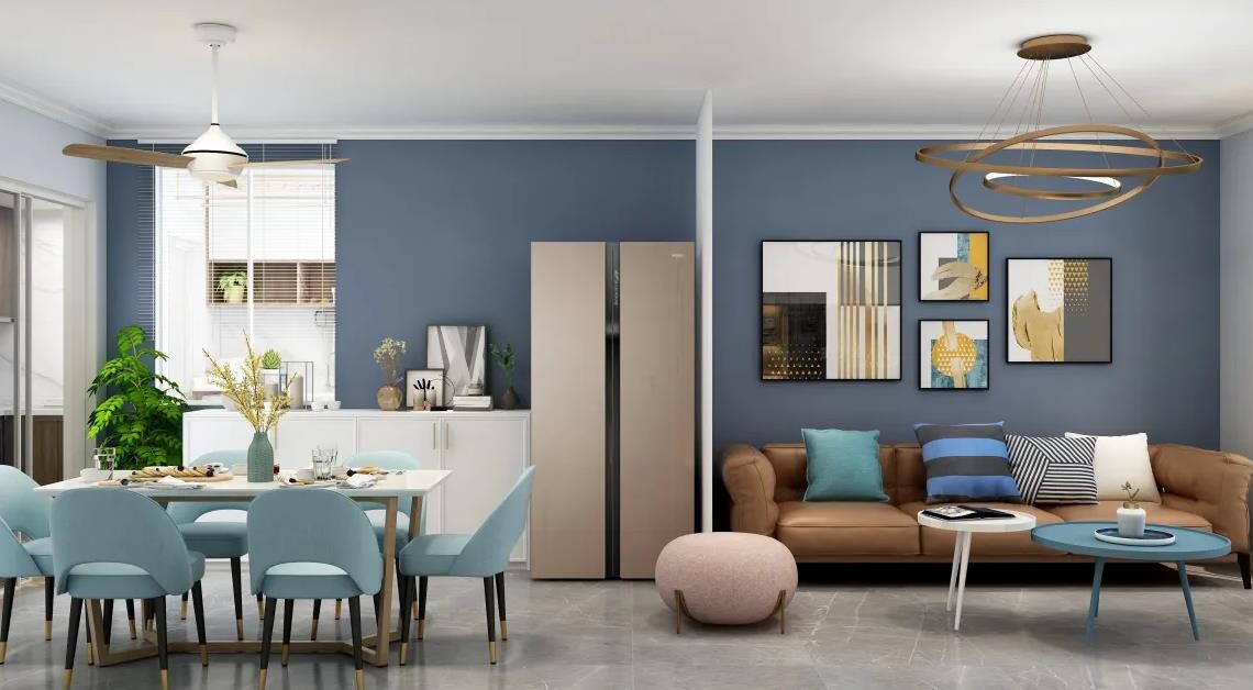 客厅背景墙整体采用重色蓝色漆做调色