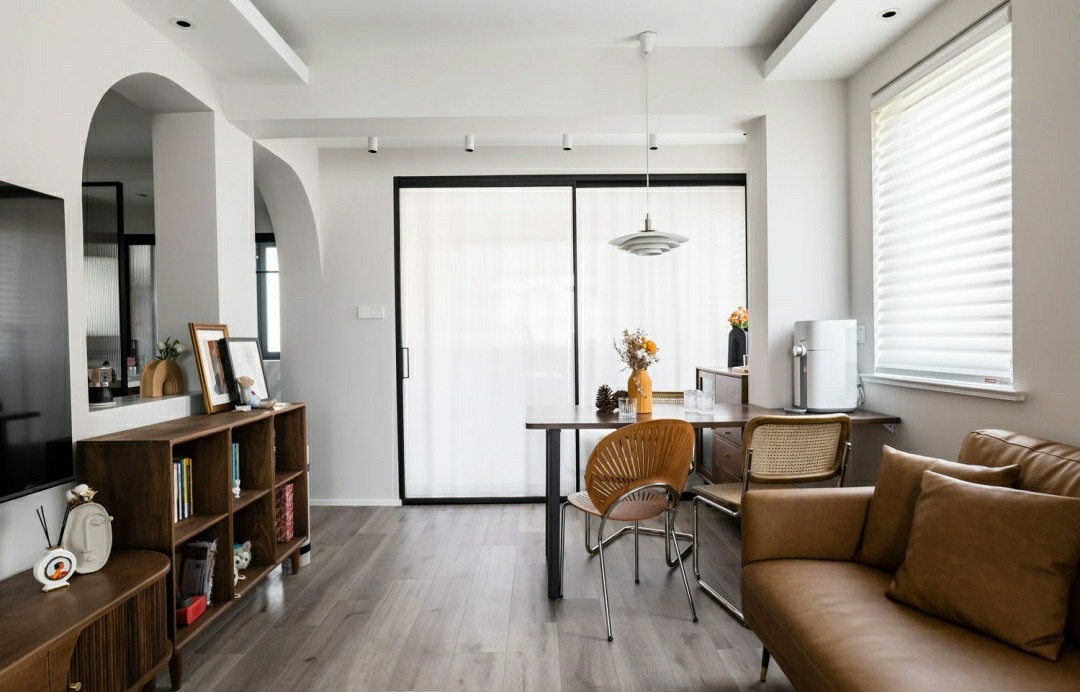 客厅现在三面采光,且是多光源,两个卧室都选用长虹玻璃三联门+白纱设计,将围在中间的客厅照得通体发亮,即使选用相对深色的胡桃木色家具也不会感觉暗沉。