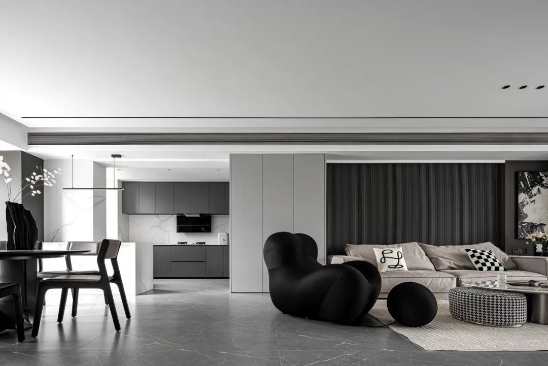 厨房、客厅与餐厅的开放式设计,让空间与空间之间产生对话。区域规划、比例与材料的分配,公共区域空间大面积采用灰色烤漆板。