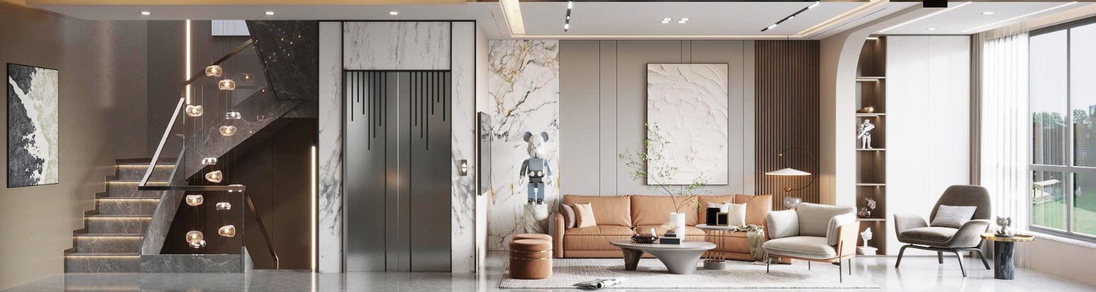 客厅偏明亮色调,灰白的色调+橙色沙发的撞色处理,中和了冰冷的感觉,无形中透露出温馨无主灯加线型灯的设计时尚大方。
