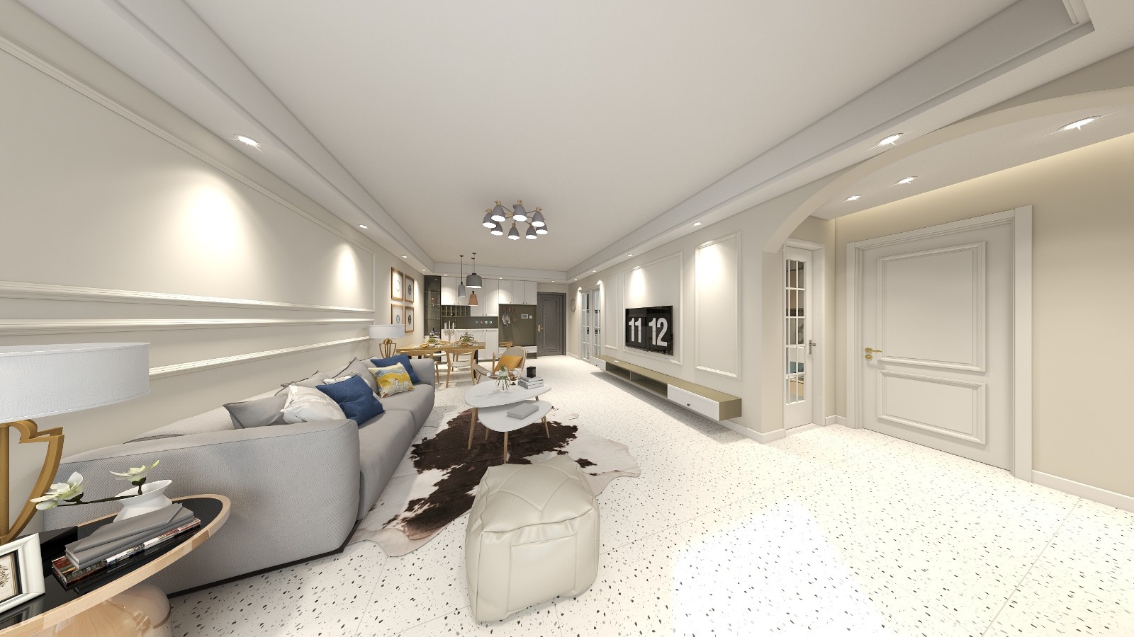 客厅主打浅暖 色系,突出了造型上的混搭。