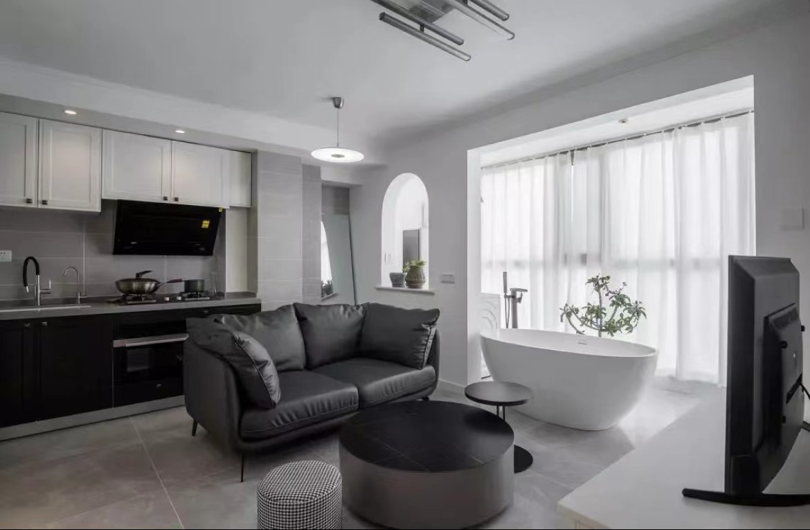 黑色橱柜,显得更加沉稳、***。白色吊柜可以与墙面的白色保持•致,无形中放大了空间感大吸力油烟机和嵌入式蒸烤箱对于几乎只做简餐的冯先生来说,日常足够用。