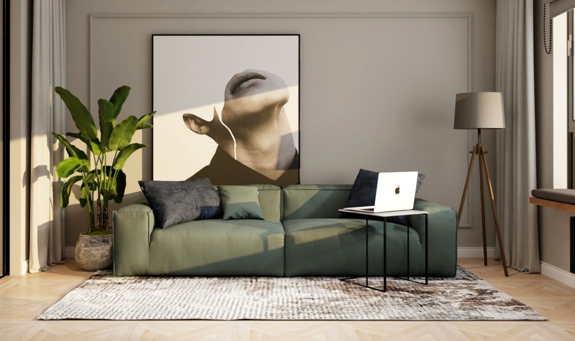 沙发一旁有盆大大的绿植,清新优雅。