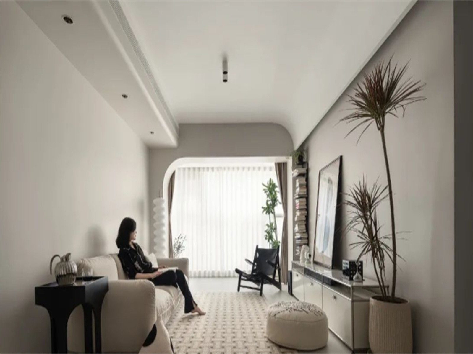 本案常住两人,既不会显得空寂,也没有拥挤的烦恼,设计以温柔简约的奶油白为主调,减少视觉上的繁乱感,空间犹如一张上好画布,用弧线、灯光、艺术材质,描摹出一个隐奢生活空间
