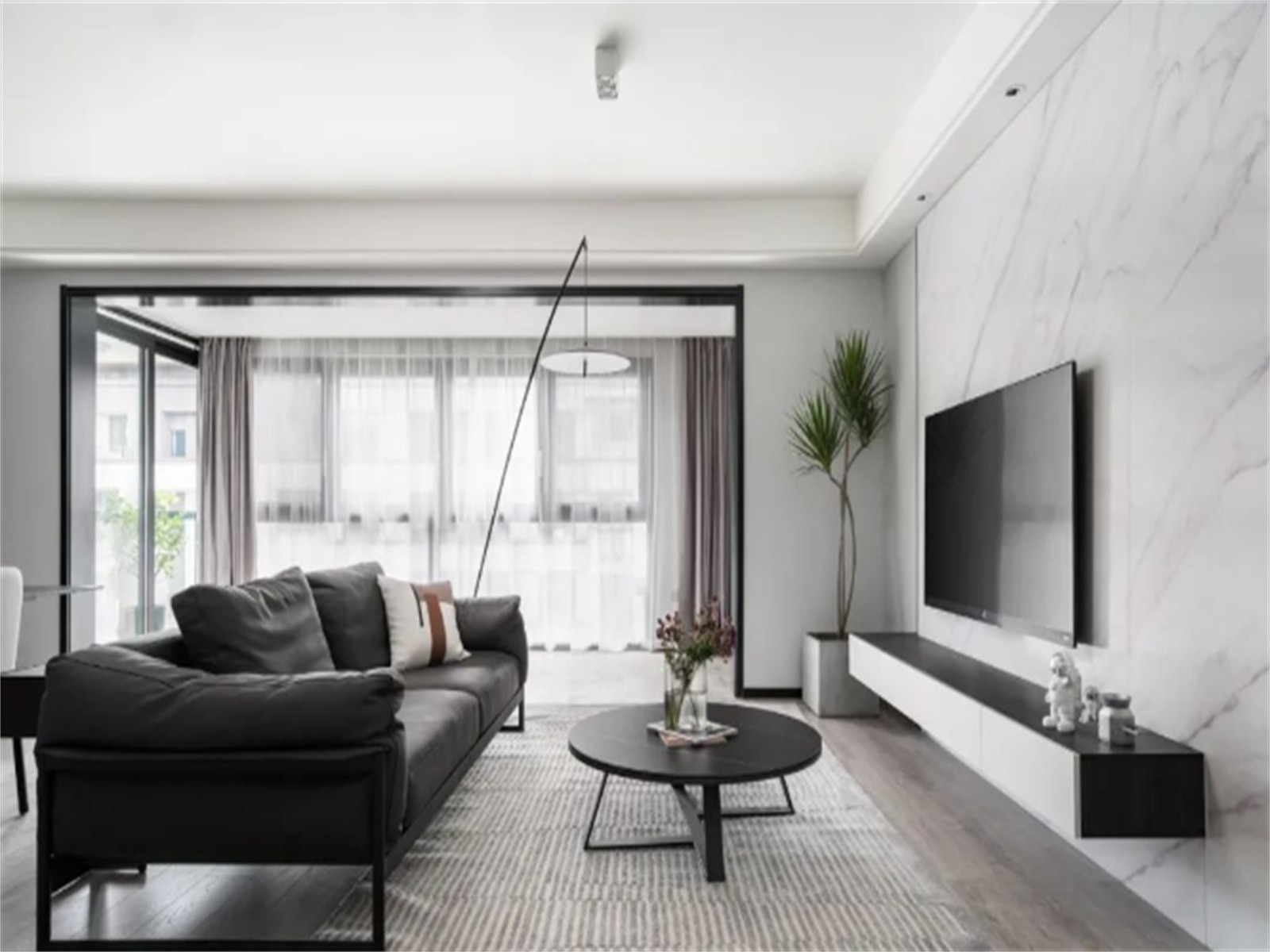 电视背景墙,爵士白石材饰面搭配绿植,生活的意趣一展无遗