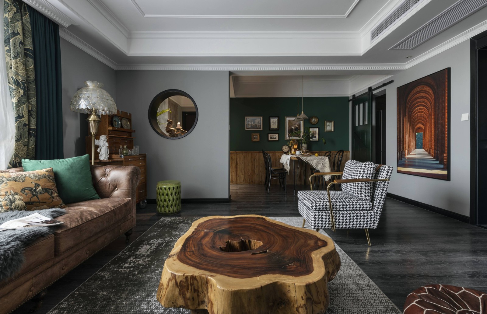 餐厅以暖色老木板与深绿色进行冷暖强烈对比,自然光影与氛围灯光交相呼应