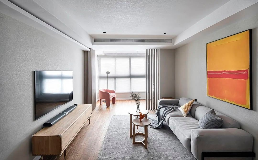 硬装线条回归简约,无主灯设计+局部吊顶,让层高更为开阔。 考虑到屋主***宝还小,在客厅玩耍时间较多,茶几选择可轻易搬移的。