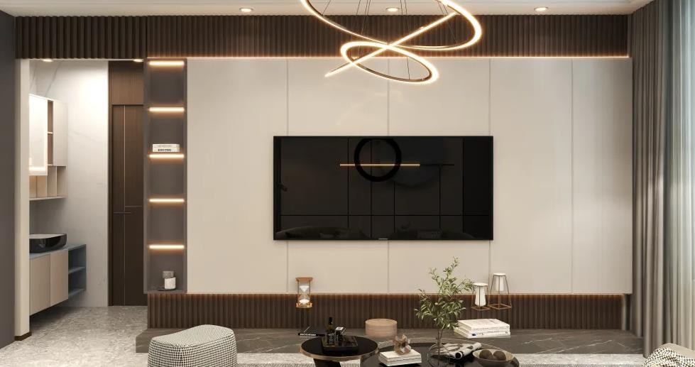 客厅电视背景墙做的是正面柜子,搭配灯带点缀和木饰面装饰,很出效果