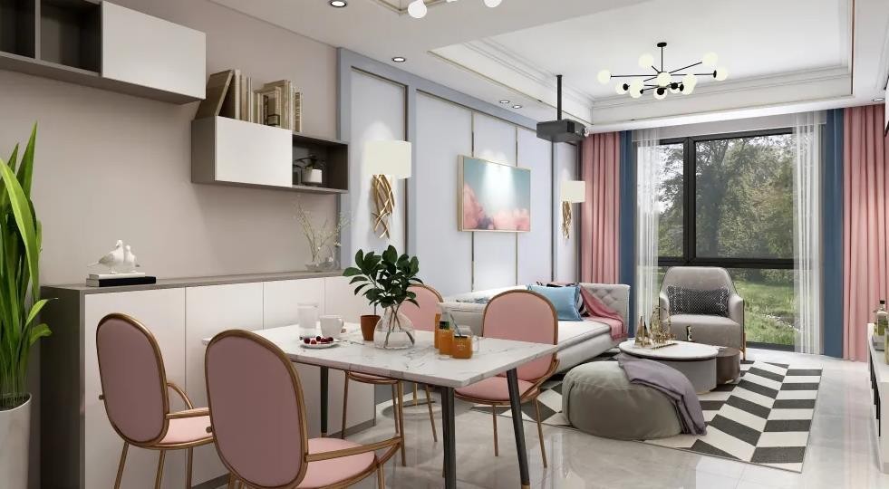 以轻奢为主旋律,整体空间明亮,色彩柔和。色彩搭配采用蓝粉灰,淡灰为主色,蓝,粉为辅色,餐椅与窗帘特别选用了马卡龙粉,浓浓的少女心,为整体空间增添一抹亮色。