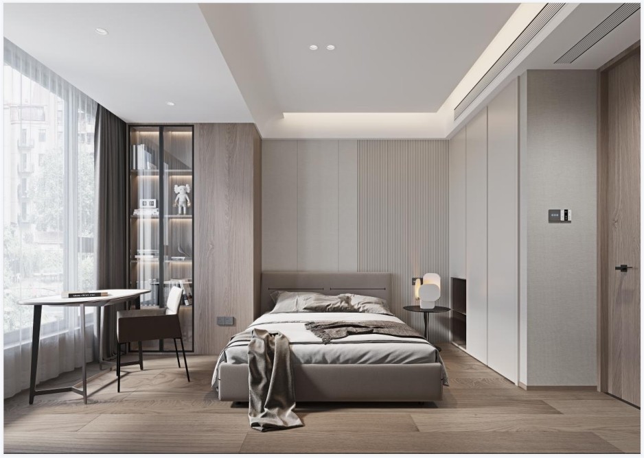 透过弧形天花降低因梁位吊顶而带来的高低落差感,过渡得更自然。玻璃柜门弱化包管道而带来柜子给的压迫感。