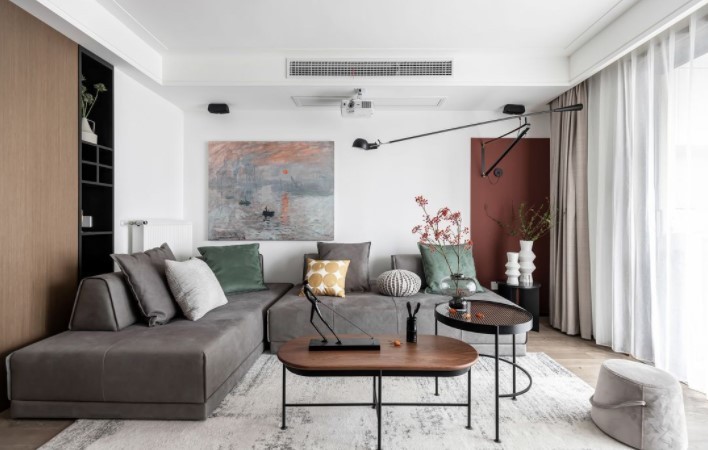沙发背景在白色调的基础上,增加一抹绯红,与莫奈的《日出·印象》色彩相呼应。