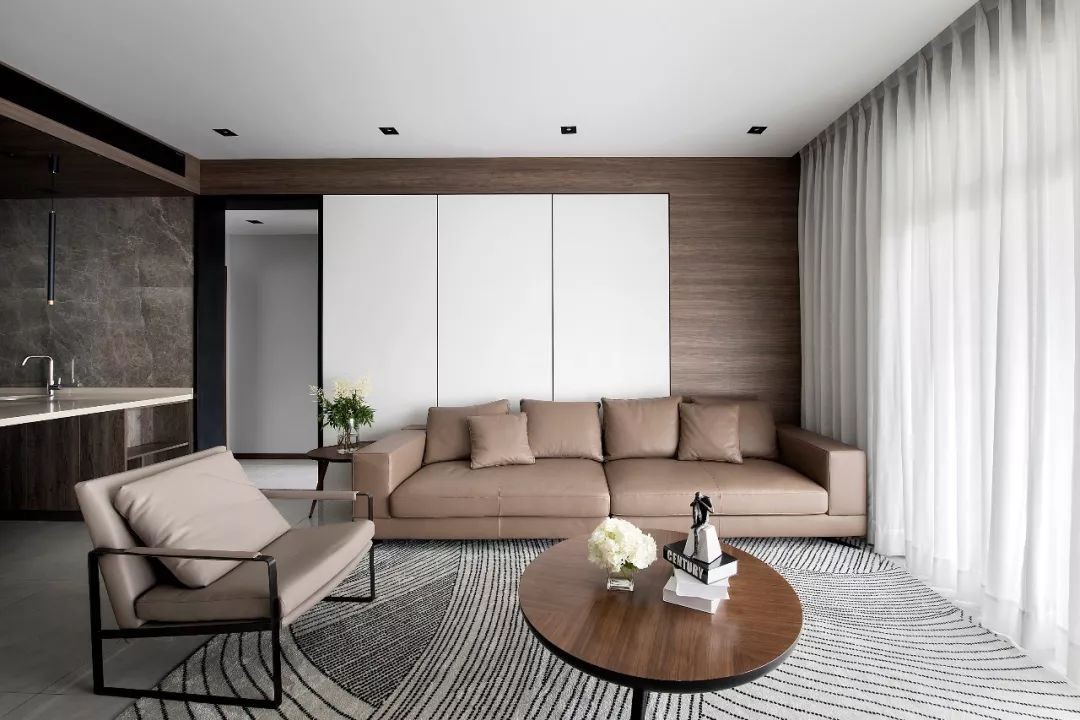 设计师在客厅墙面材质的选择上,均采用木饰面作为装饰,更倾向于营造出大气简约的氛围。