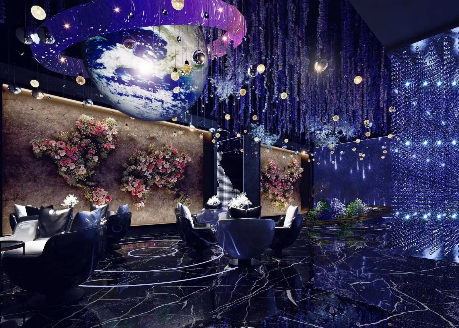 以梦幻蓝色色调为主,搭配点缀式地球美陈,配合深色地砖,如梦如幻