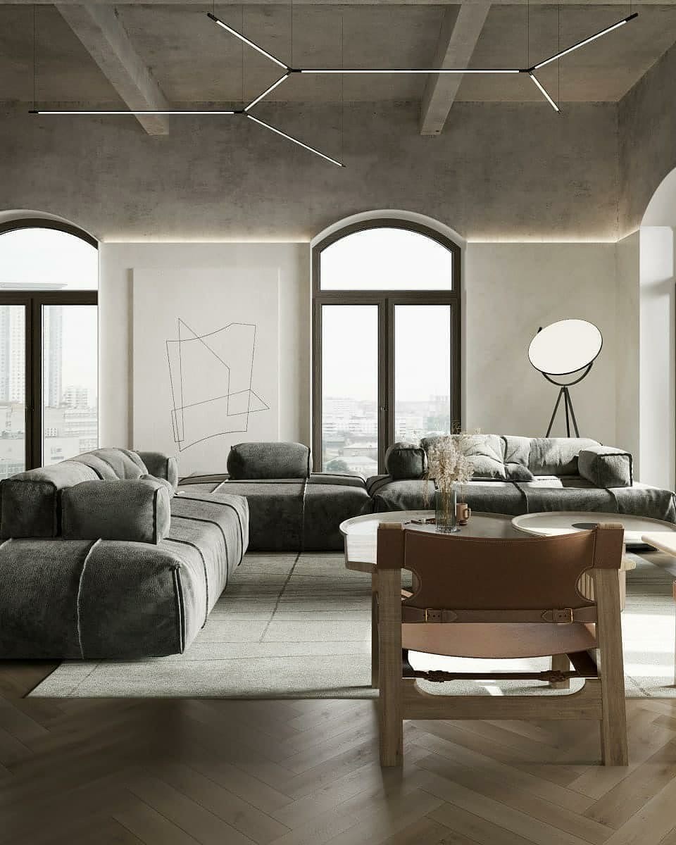 客厅从色彩上来看就知道是现在比较小众的侘寂风,用这种仿原生态的色彩来铺面空间,奠定高端感。