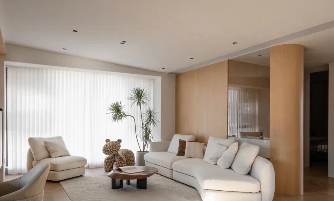 米白色的沙发和水曲柳的木纹营造出温暖和质感相融交织的氛围。
