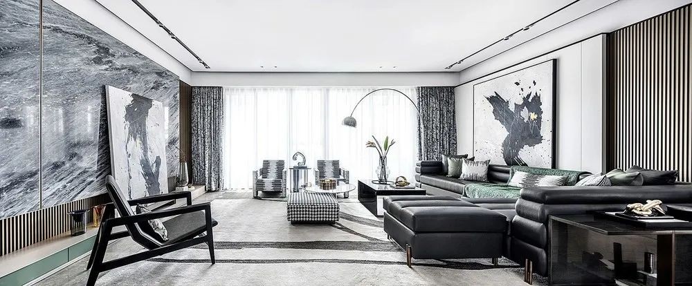 电视墙以地台式电视柜的定制,背景墙以长城板+岩板的背景组合,摆上一幅黑白墨色的装饰画,在无主灯的空间下,也为我们营造出一个简洁舒适的客厅氛围。