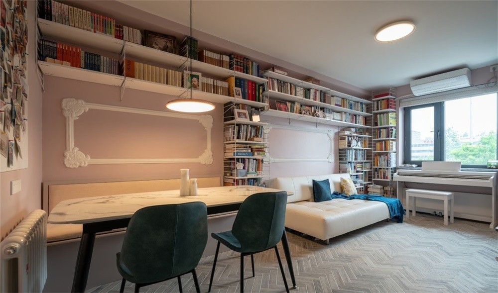 进到客厅是客餐厅一体化的设计,没有刻意区分客厅、餐厅,为了让空间更加开敞从而视觉上显得空间更大。墙面选用的是浅豆沙色,配上暖黄色的灯光,很安逸温馨。 卧室