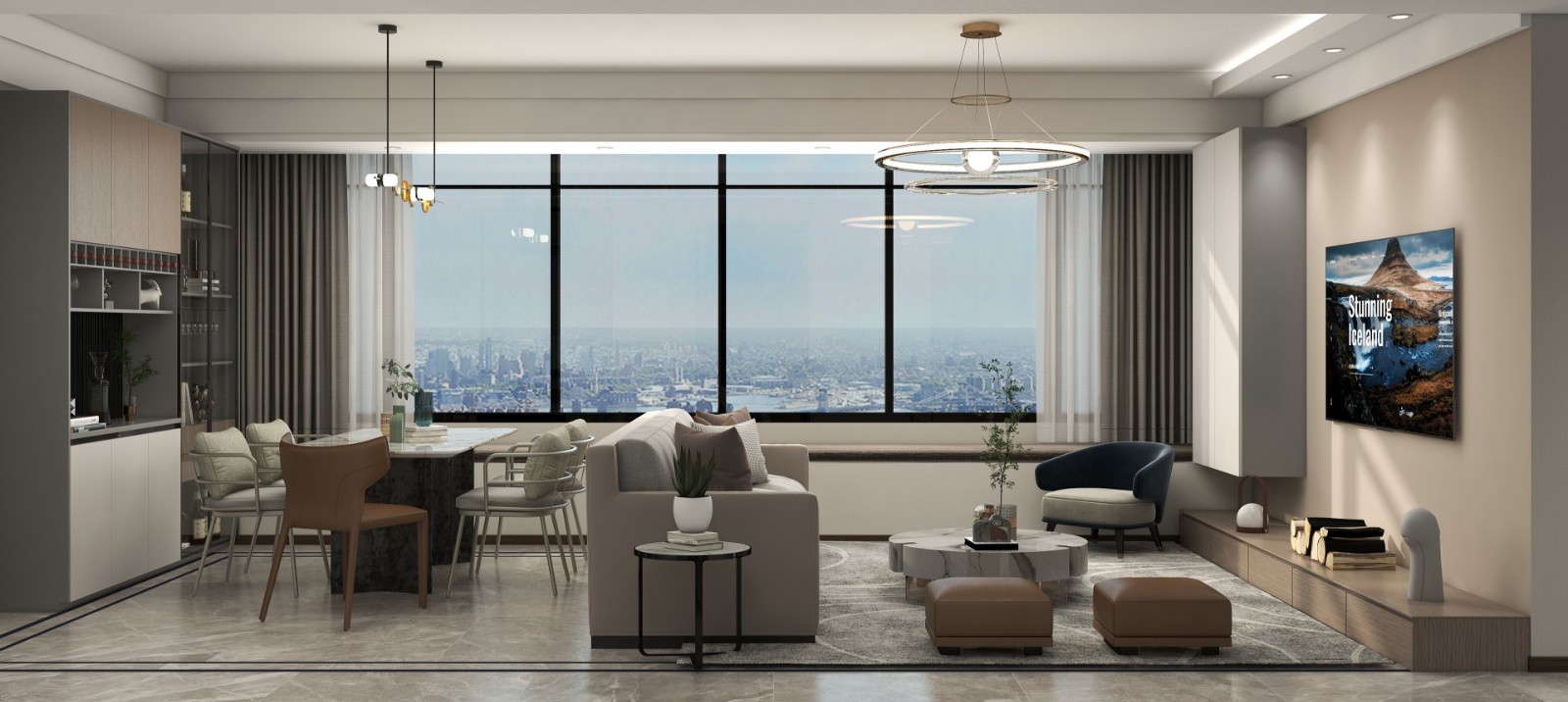 客餐厅整体用中性色作为主色调,用橙色和蓝色作为跳色点缀