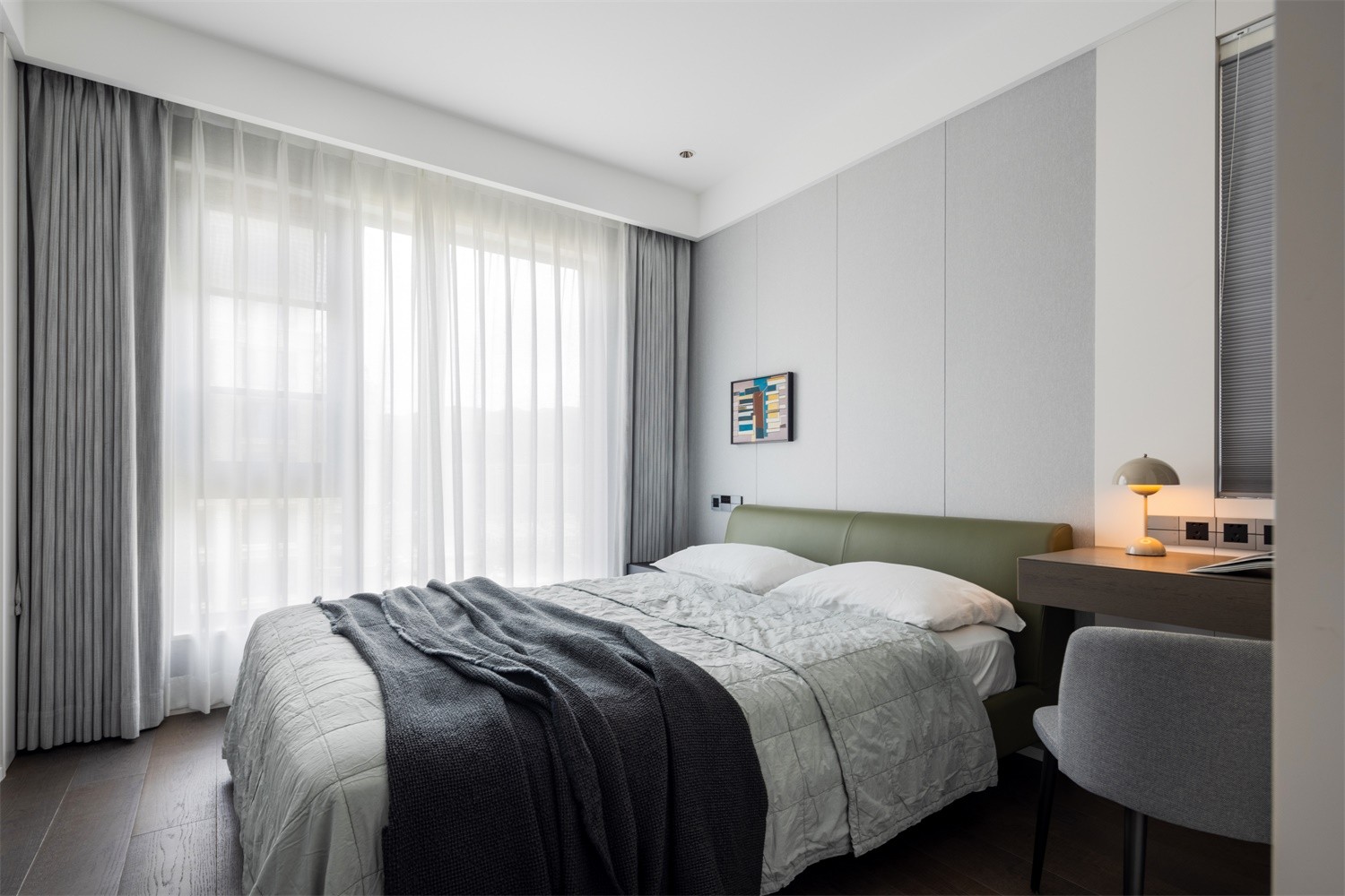 客厅向外,卧室朝内,更注重私密与温馨的表达。不同于一楼的黑白色调带来强烈的反差感,而是偏向于低饱和度的灰调色彩,引述向平静的内心感受。