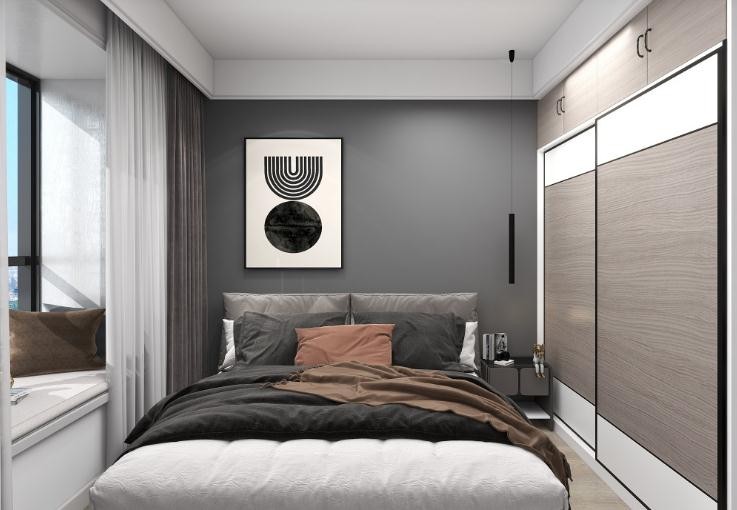 主卧室的空间有限,所以在床边做了移门衣柜来增加收纳空间
