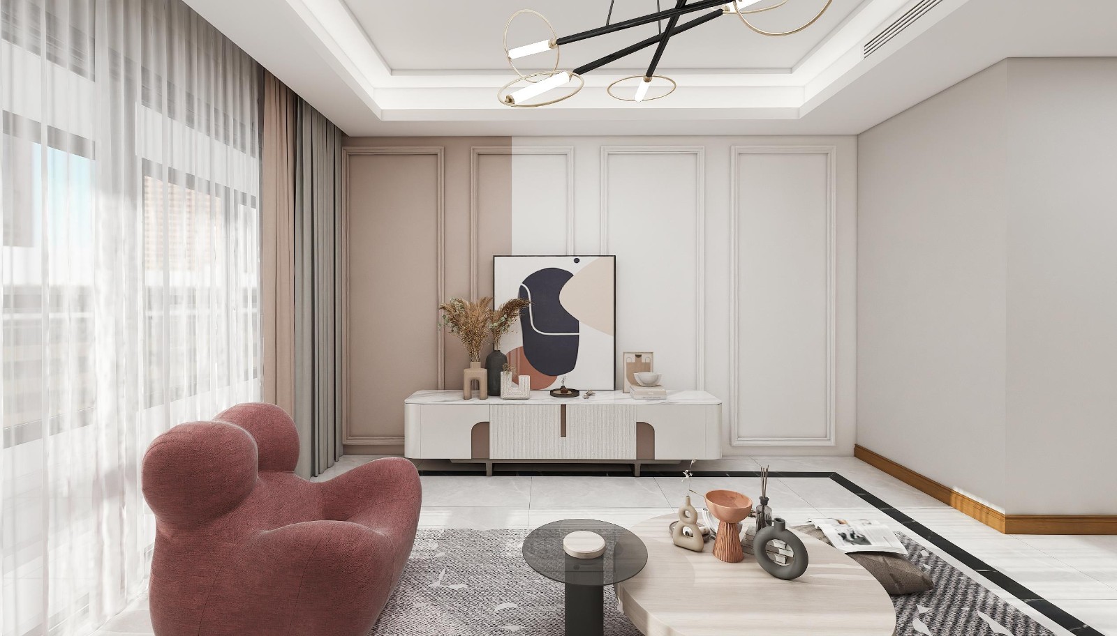 客厅背景整个色系采用奶油风双色拼接,电视背景加了线条使整个空间更有层次感