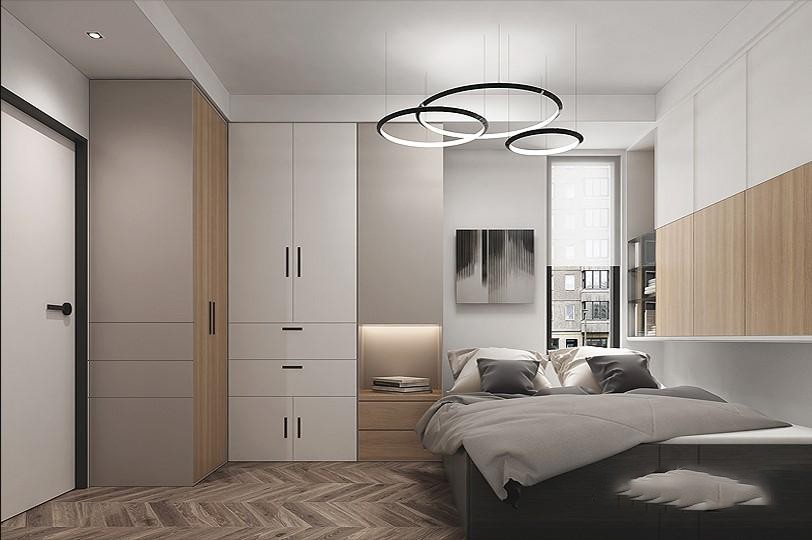卧室大床云运用咖色 即时尚又精致,衣柜运营原木色和和白色交替,让空间温馨感十足