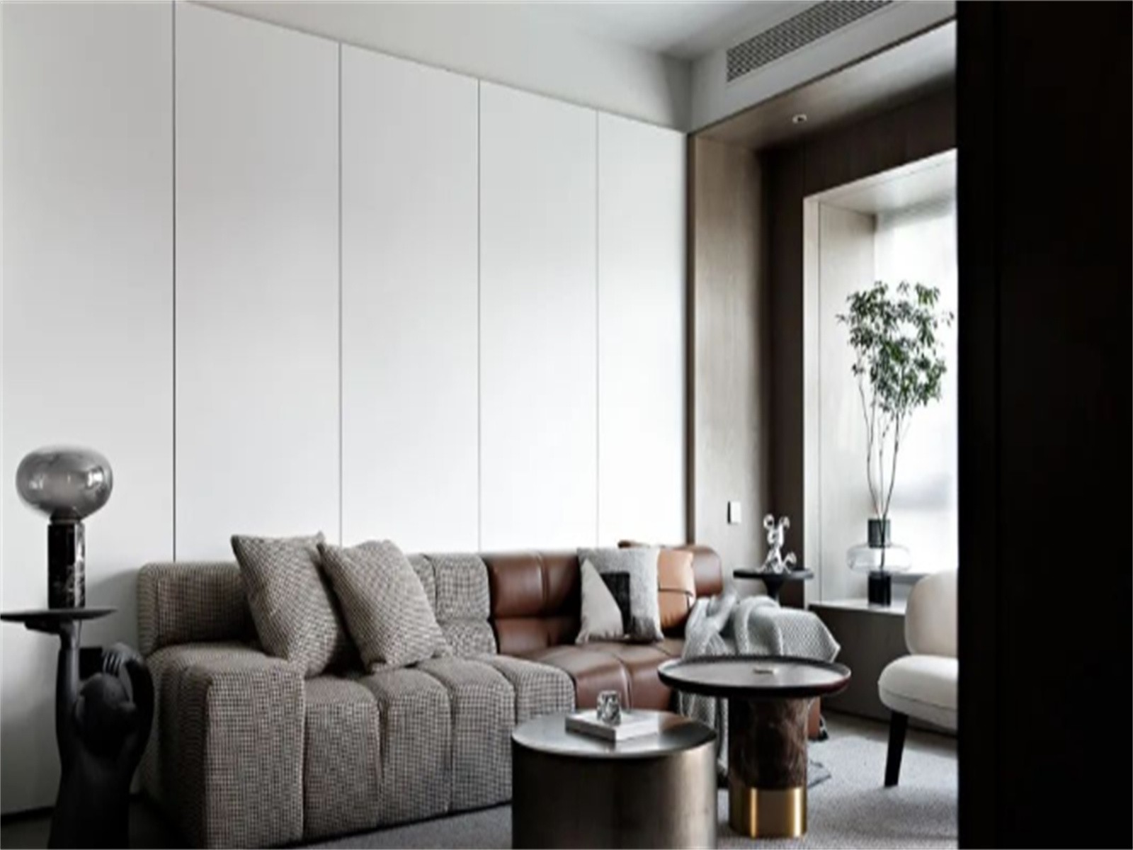 客厅,空间色彩白与咖碰撞,优雅而朴素,沙发布艺与真皮的拼接舒适且充满质感