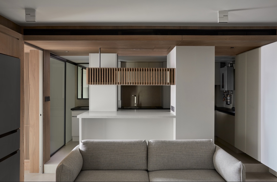 客厅与卧室之间的墙面,是温馨的原木色,兼具一定的收纳能力。设计师把计量单位精确到毫米,把深灰色的双开门大冰箱嵌入其中。 卧室透光不透人的长虹玻璃门,也能把足够的光源引入室内,进一步解决室内的采光问题。