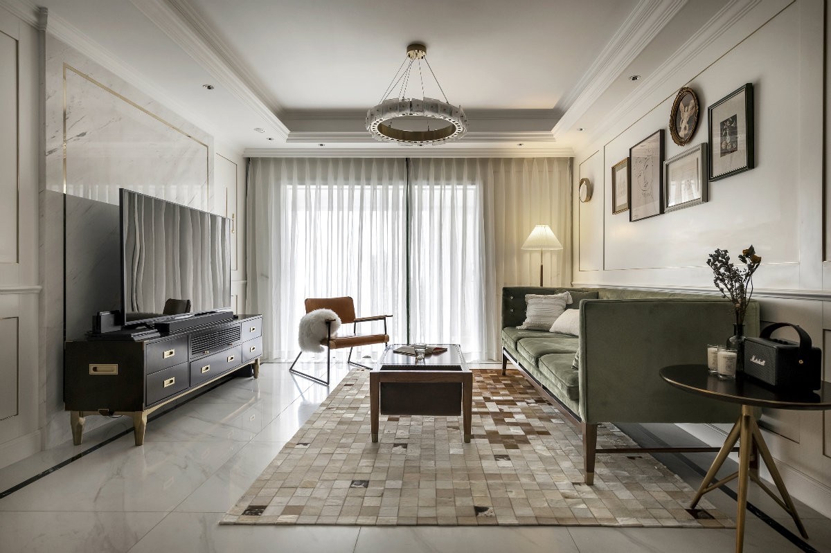 圆点装饰的莫兰迪粉色墙纸搭配毛茸茸的沙发椅,作为装饰,丰富了空间,还为主卧室增添了些许趣味