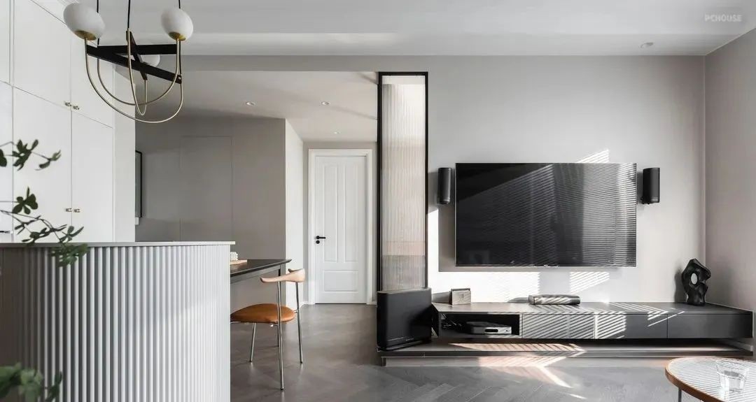 进入客餐厅是一个综合的开放区域,整体风格自然、明朗。硬装没有进行明显的区域划分,而是通过软装进行空间软化分。顶面运用了局部吊顶+无主灯设计,避免空间的压迫感。