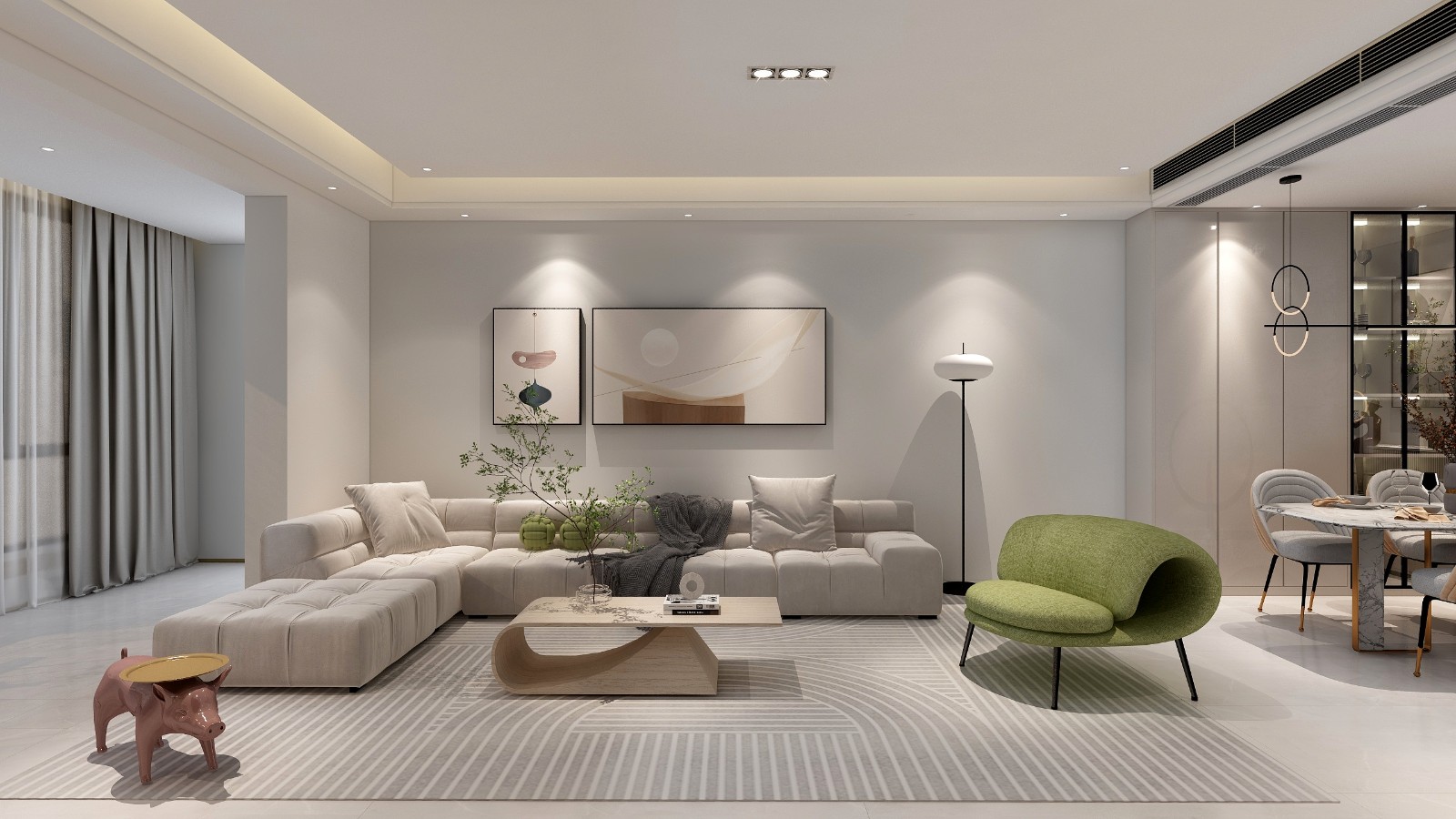 业主是两个20多岁的年轻人,喜欢简单一点,带奶油风的感觉,想要大沙发大电视墙,酒柜,整体干净整洁,考虑用无主灯设计,使顶面平整干净。