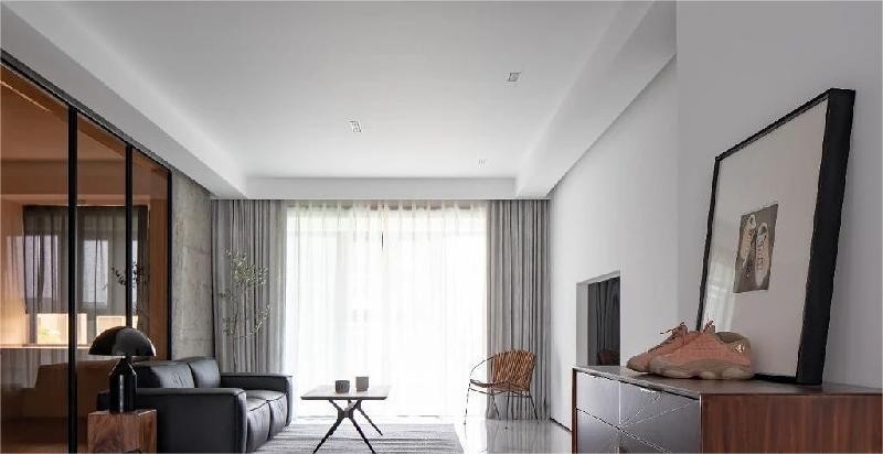 由于房子目前只有屋主夫妻二人居住,于是将预留出的儿童房设计成半封闭的潮鞋展示区,利用茶色玻璃作为与客厅的分割,配合灯带以及自然采光,使客厅在光影变幻中,形成不同的空间使用模式,从而改变空间的属性,制造出不同层次。由此也使得屋主珍藏的「潮鞋」变成空间内的展示主体。