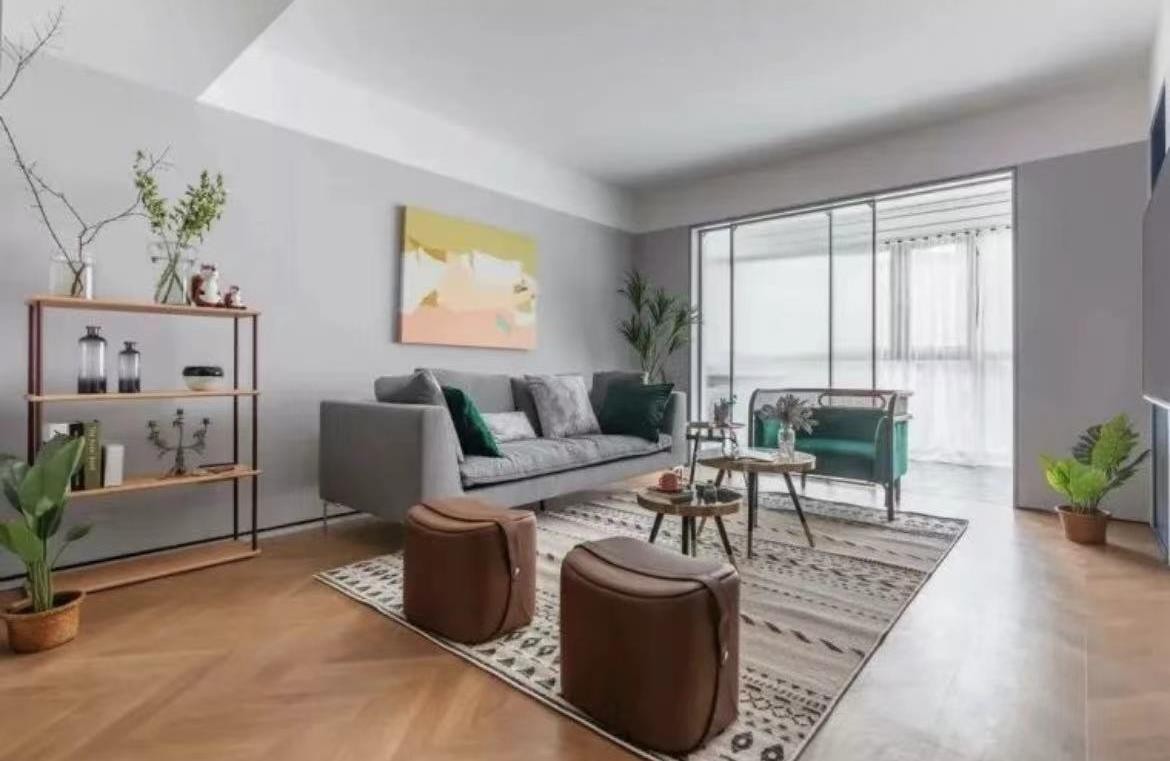 客厅地面是鱼骨铺的木地板,以简约的空间营造出惬意自然的氛围,布置北欧范的家具,带来一个休闲从容的生活体验