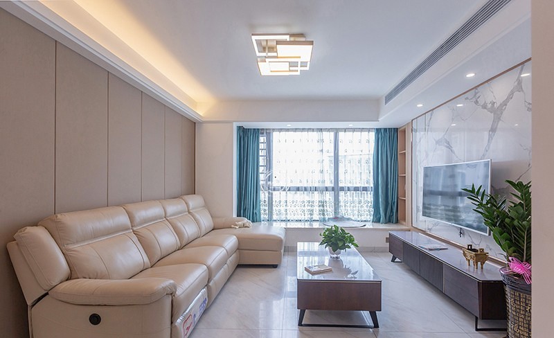 大理石纹与金属的搭配是轻奢风背景墙永不出错的精致。吊顶通过弧形线条柔和空间硬度,墙布和沙发也选择了素净的米色,通透明亮,营造温暖舒适的居家氛围。