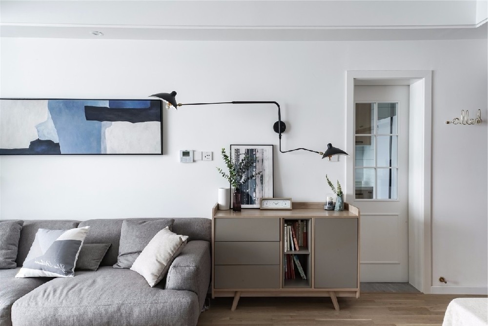 洁净的沙发墙上挂着一张横幅抽象画,灰色布艺沙发旁边一个小矮柜,在精致清新的摆饰品与绿植布置下,显得清新雅致。