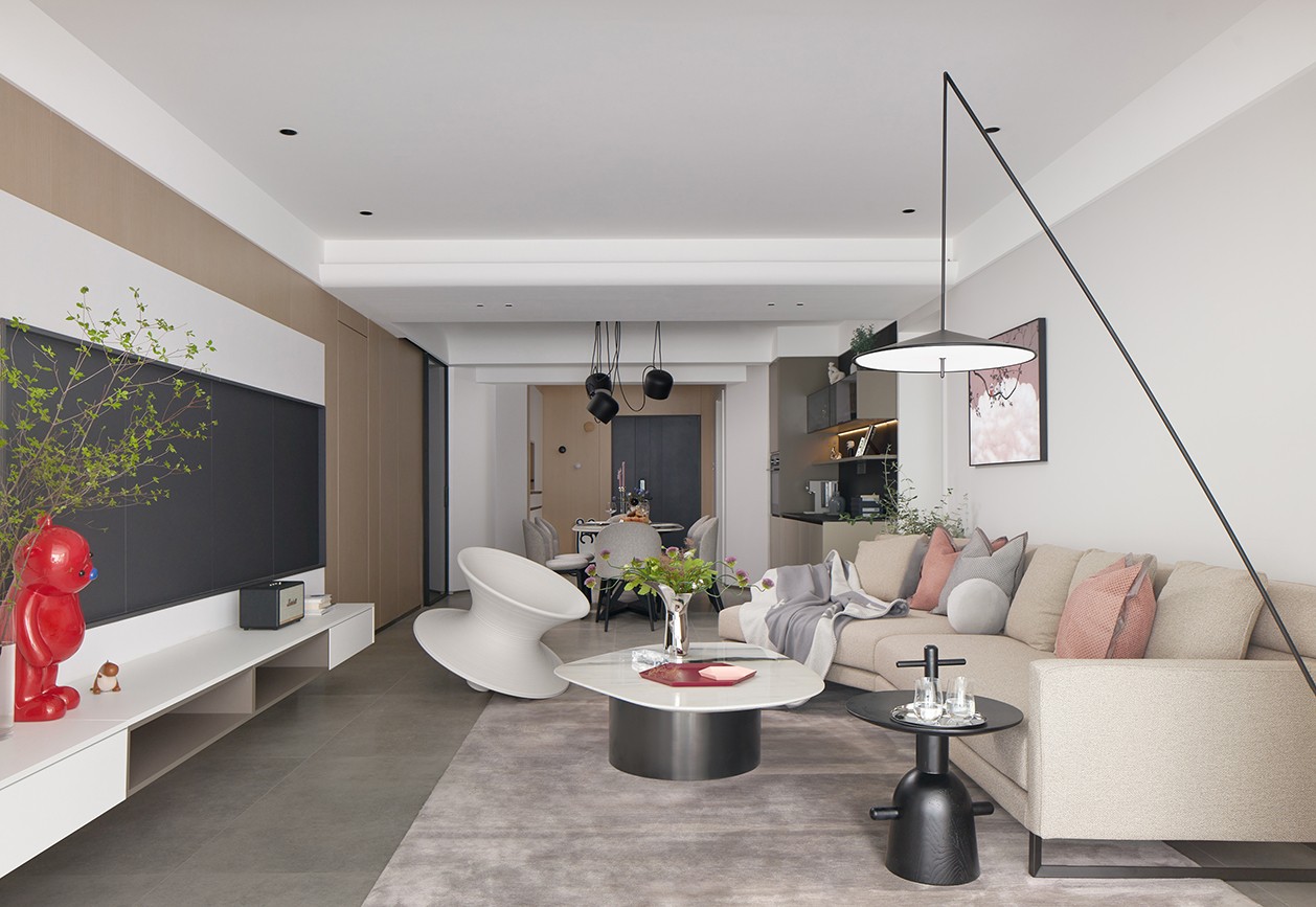 客厅与阳台联通无阻,让亲子间的互动交流更为畅通。全景落地窗让阳光能肆意挥洒进来,确保室内拥有充足采光。电视柜上摆放着艺术家张占占签名的限量版小熊雕塑,俏皮可爱,为空间带来了活力色彩。