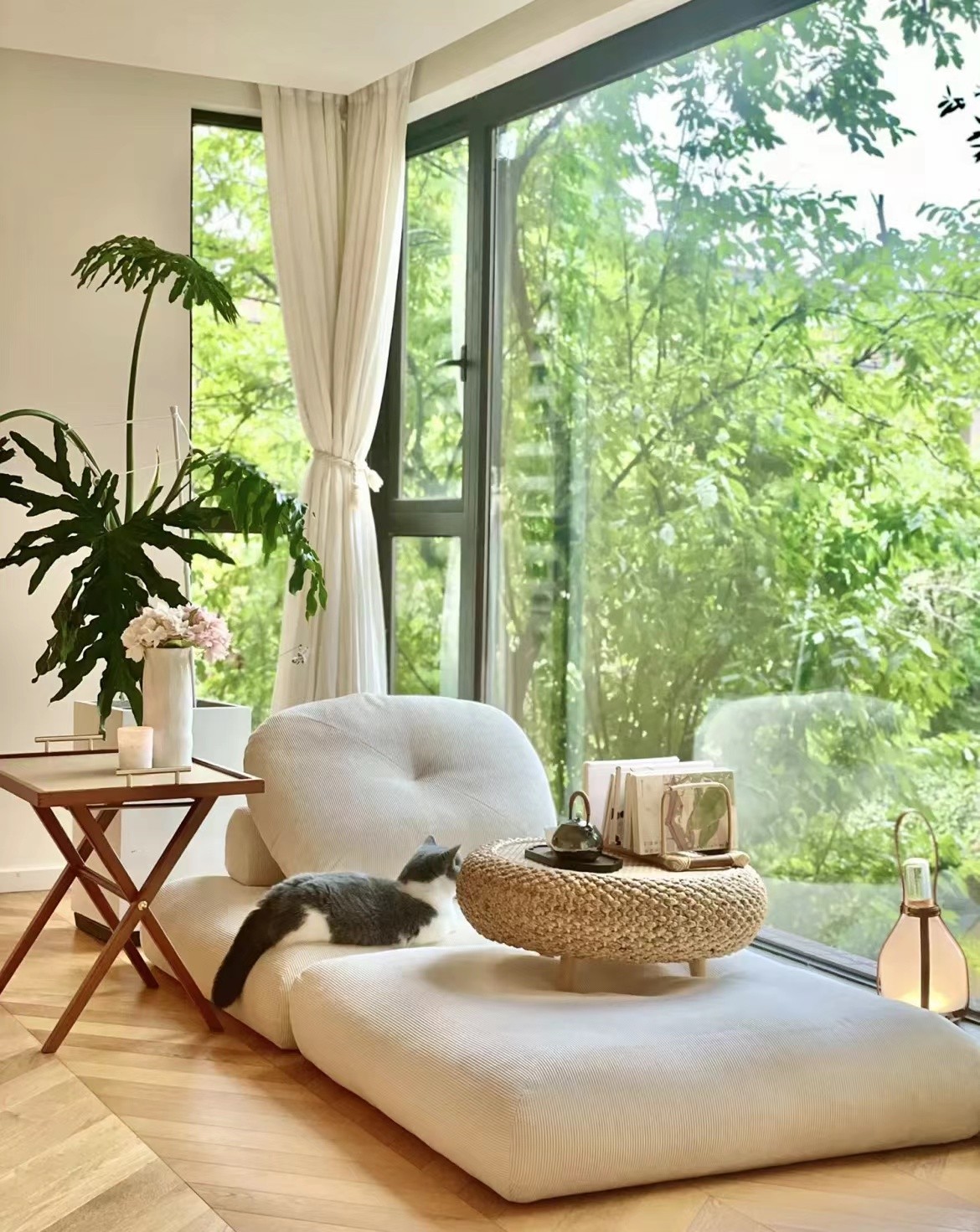 窗边坐垫式沙发以及小边几、绿植的搭配给人一种放松的感觉、望向窗外景色春可赏花、冬可以看雪