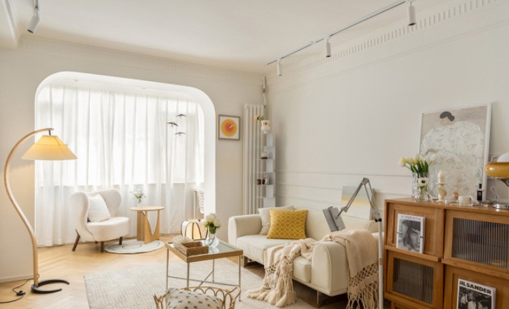打开原本南向卧室的隔断墙改为客厅,整体以暖白色为主,点缀的原木也增加了一点温润感
