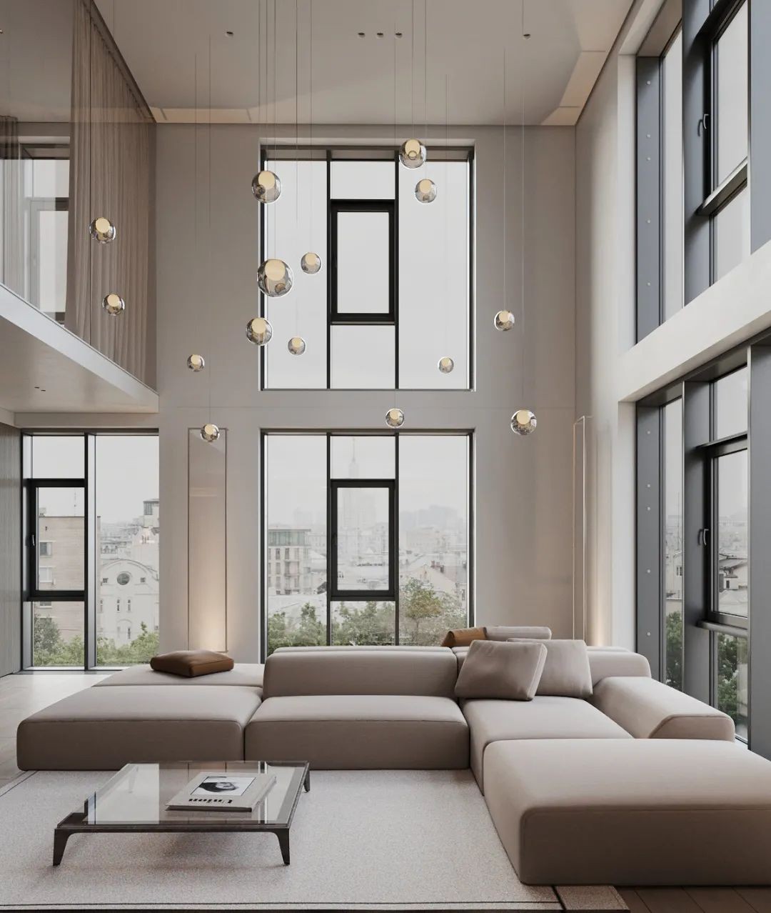 客厅中,L型的模块沙发,两个方向都可以坐。周围环绕着大面积的落地窗,既保证了室内拥有充足的光线,也可以欣赏到窗外城市的美景。空中的点状装饰,宛如点点繁星,增添了空间的精致美感。