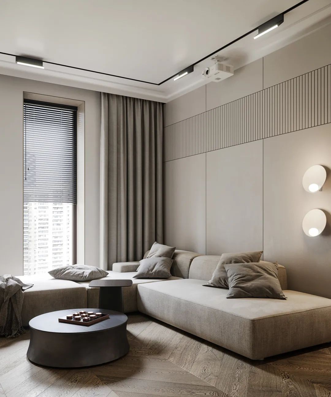宽敞的客厅让人有种豁然开朗的体验,各种深浅不一的棕色系材料相互重叠,丰富了空间的层次感。浅灰色的布艺沙发与棕色的电视墙面相结合,搭配上深棕色的圆形茶几,整体的色调统一协调,十分养眼。