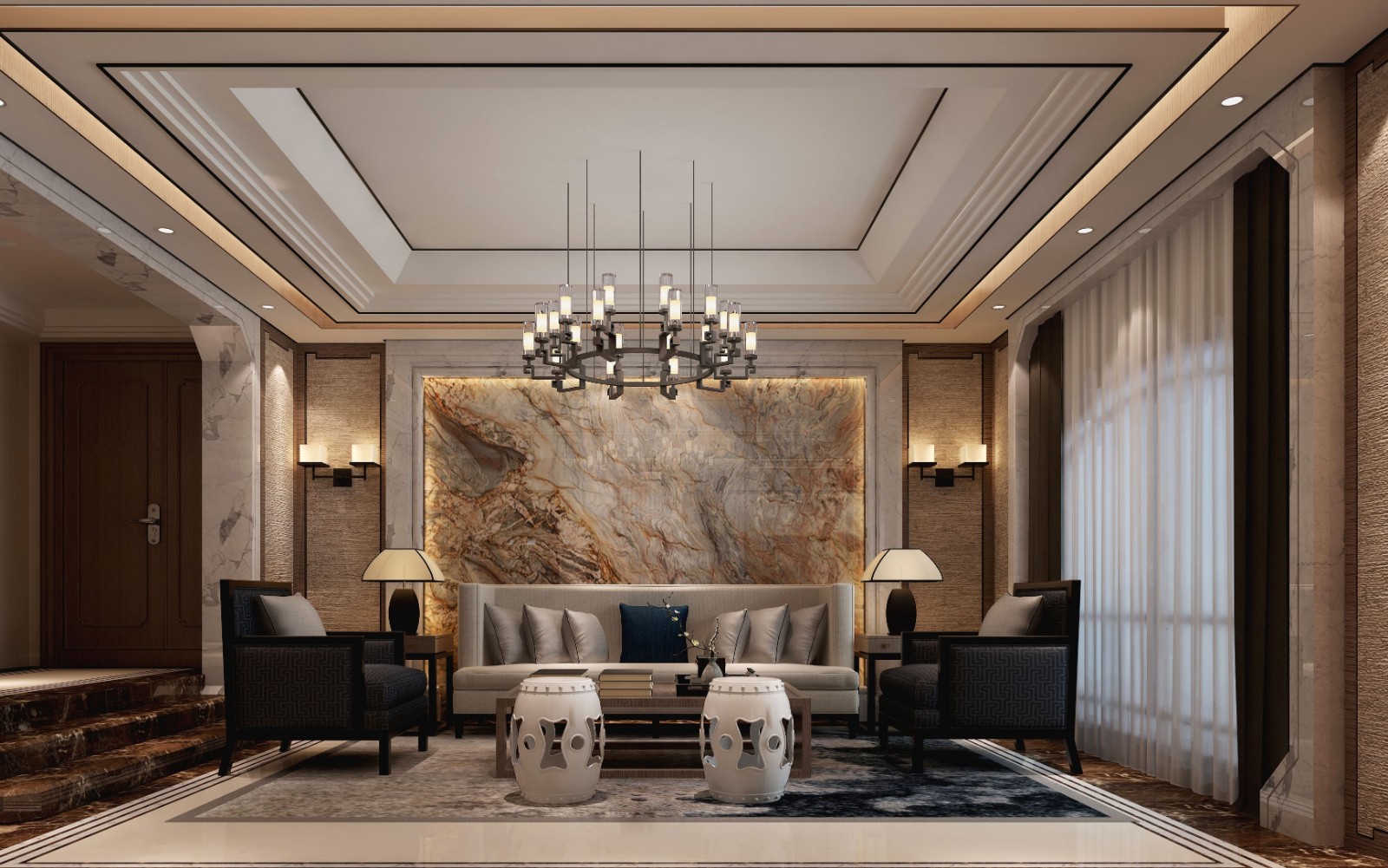 石材背景拼花,自然大气,配上中式圆凳,青花瓷的配画,每一面都是故事。