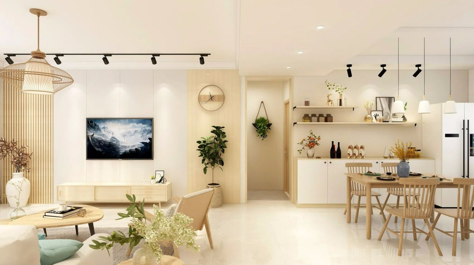 客餐厅一体,家具多为原木色。