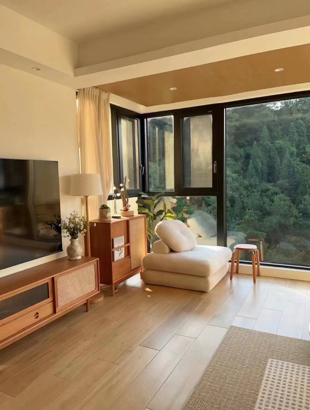 实木地板,大大落地窗,借助外景,让屋里生机勃勃