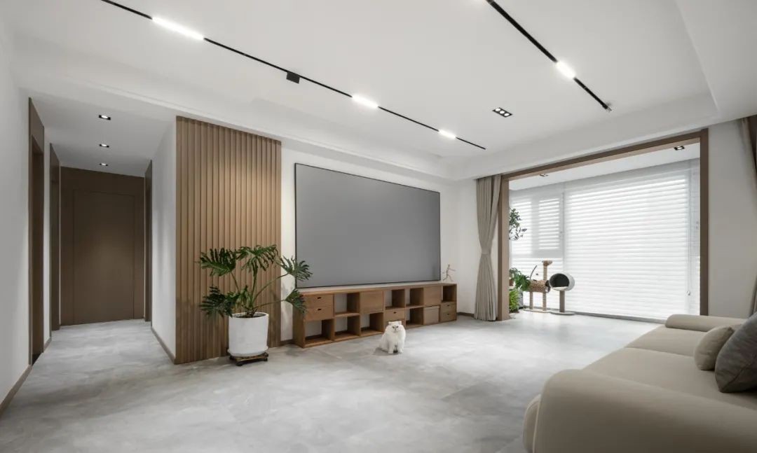 留白的墙面,水泥灰的地面,核桃木色的木作和家具让空间黑白灰层次分明。