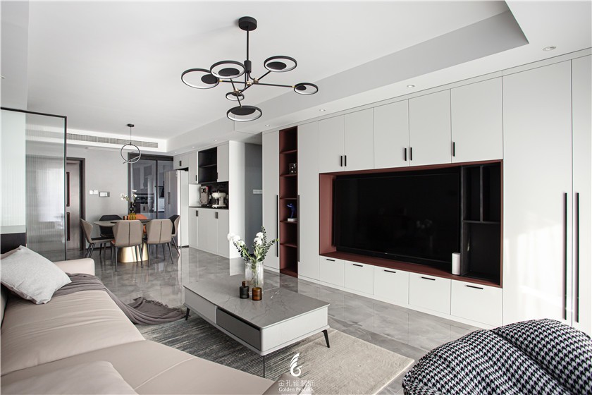 客厅电视背景墙定制储物柜,内嵌电视机,增加大量储物功能、收纳客厅的杂物,视觉上让空间更加整体,设计师采用局部棕红色与大面积白色相配,稳重雅致,抚平情绪。拼色斗柜在光影的装饰下,呈现深邃迷人的魅力,长虹玻璃屏风给空间增加些灵动